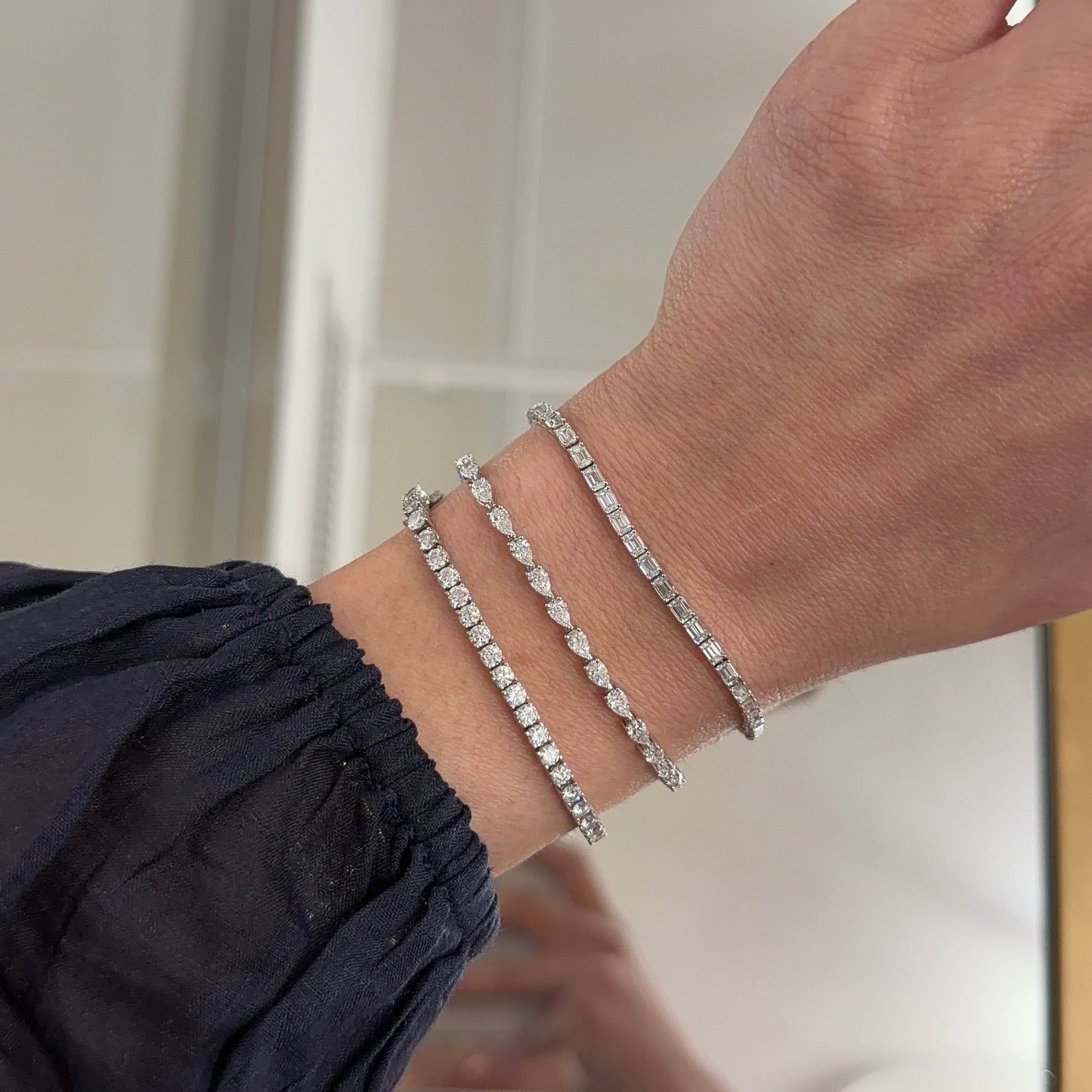 The pear-shaped diamonds, renowned for their elegant silhouette and exceptional sparkle, are expertly arranged to create a seamless and captivating look. A great piece to start your collection with or to add to your existing bracelet stack.