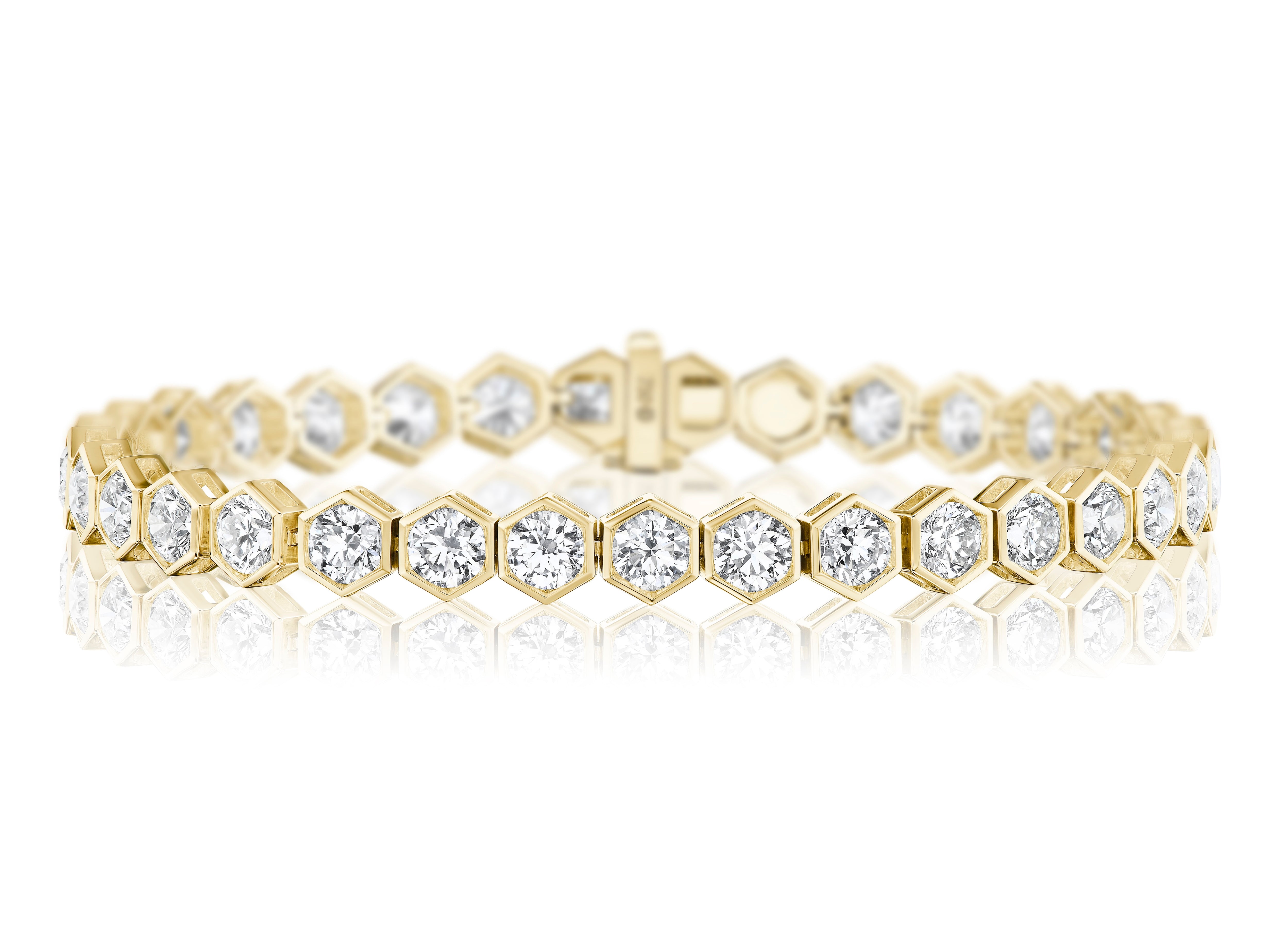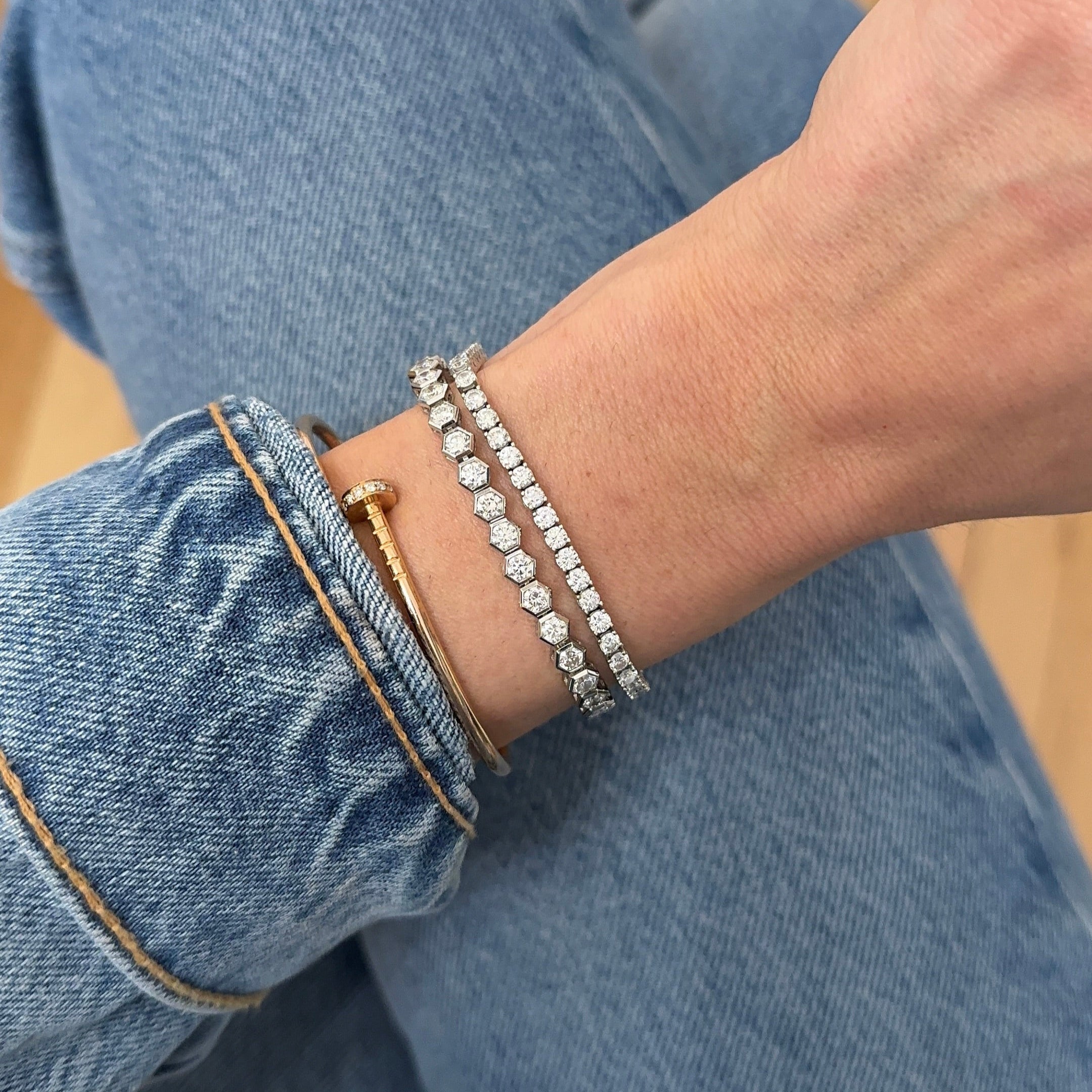 The Hexagon Tennis bracelets reimagines the infamous tennis bracelet, as dramatic geometric bezels cradle fiery, round brilliant centers. Designed for effortless luxury, this bracelet is the perfect piece to elevate any bracelet stack with it's chic & edgy design-or a show-stopper on its own!