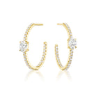 Stately prong-set diamonds line these pair of hoops boasting a pear shape accent center stone.