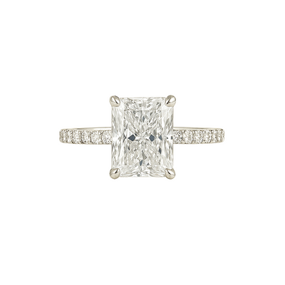 A gorgeous 2.32ct F VVS2 lab-grown radiant cut diamond is set in a 18kt white gold hidden halo and pave cathedral setting featuring approximately 1ctw of lab-grown round accent diamonds.