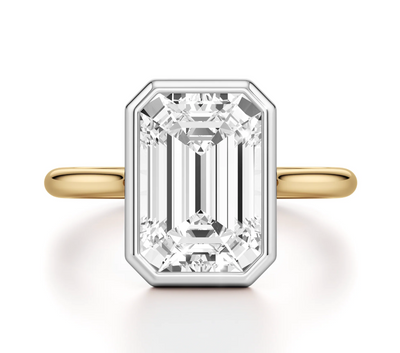 This 4.09ct emerald-cut lab-grown diamond is framed by a sleek white gold bezel with a yellow gold cathedral shank — a striking blend of modern design and timeless contrast.