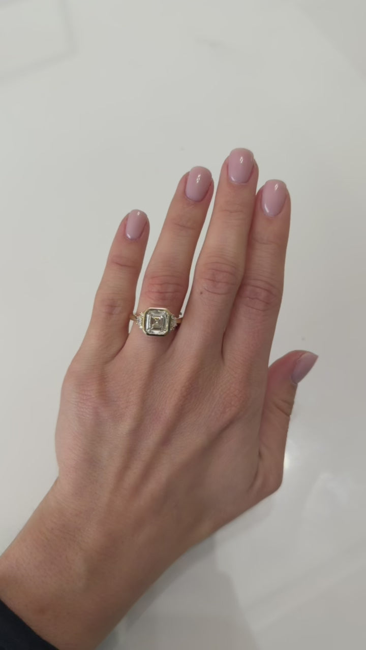 Beautifully bezeled and accented by mix-shape diamonds, this 3.01ct E VS2 lab-grown Asscher cut is the perfect mix of modern and timeless.
