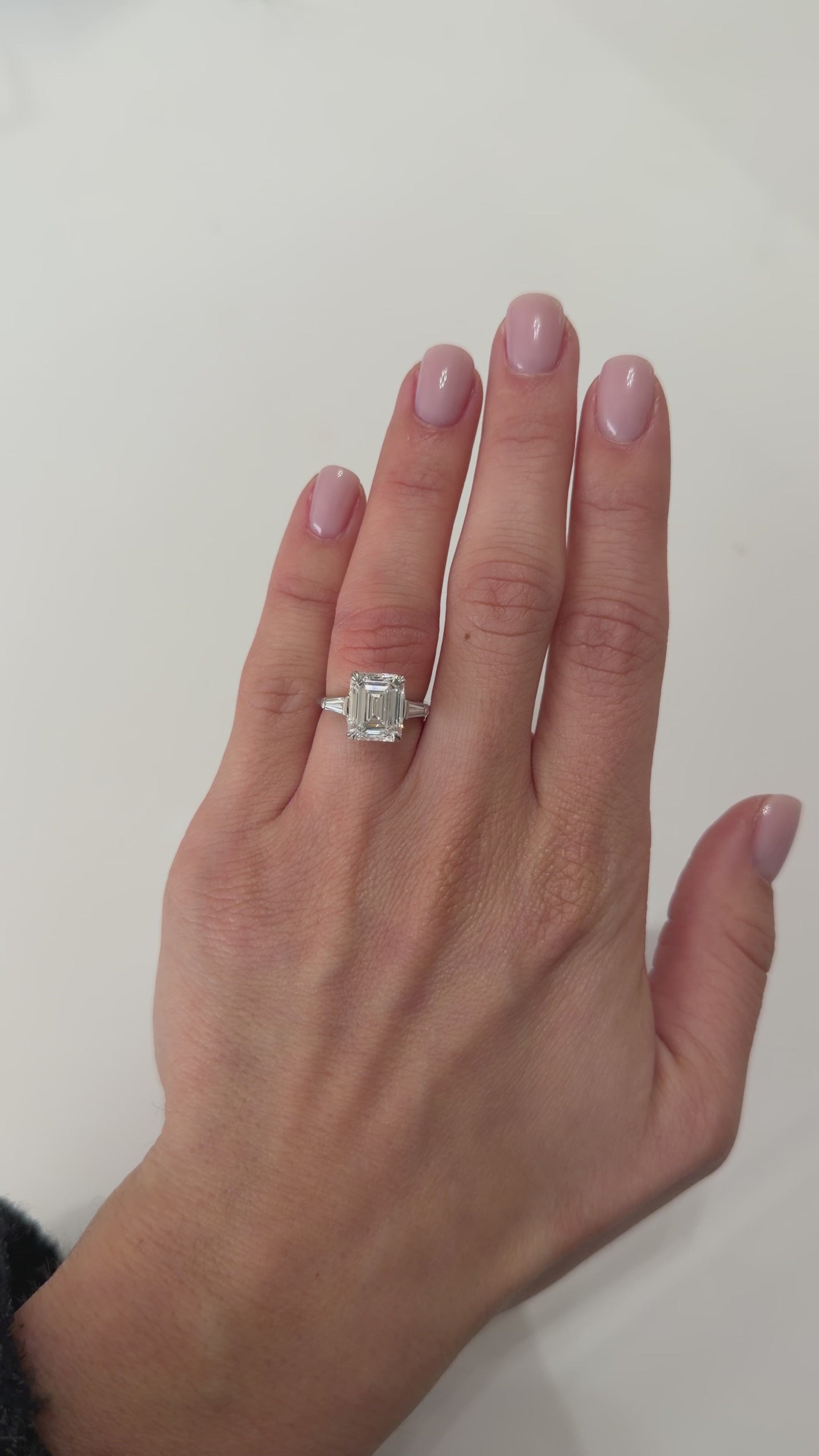 This 4.01ct lab-grown emerald cut is set in an antique platinum setting with tapered baguettes. The tapered baguettes frame the center stone in perfect harmony, evoking a quiet luxury that transcends trends and generations.