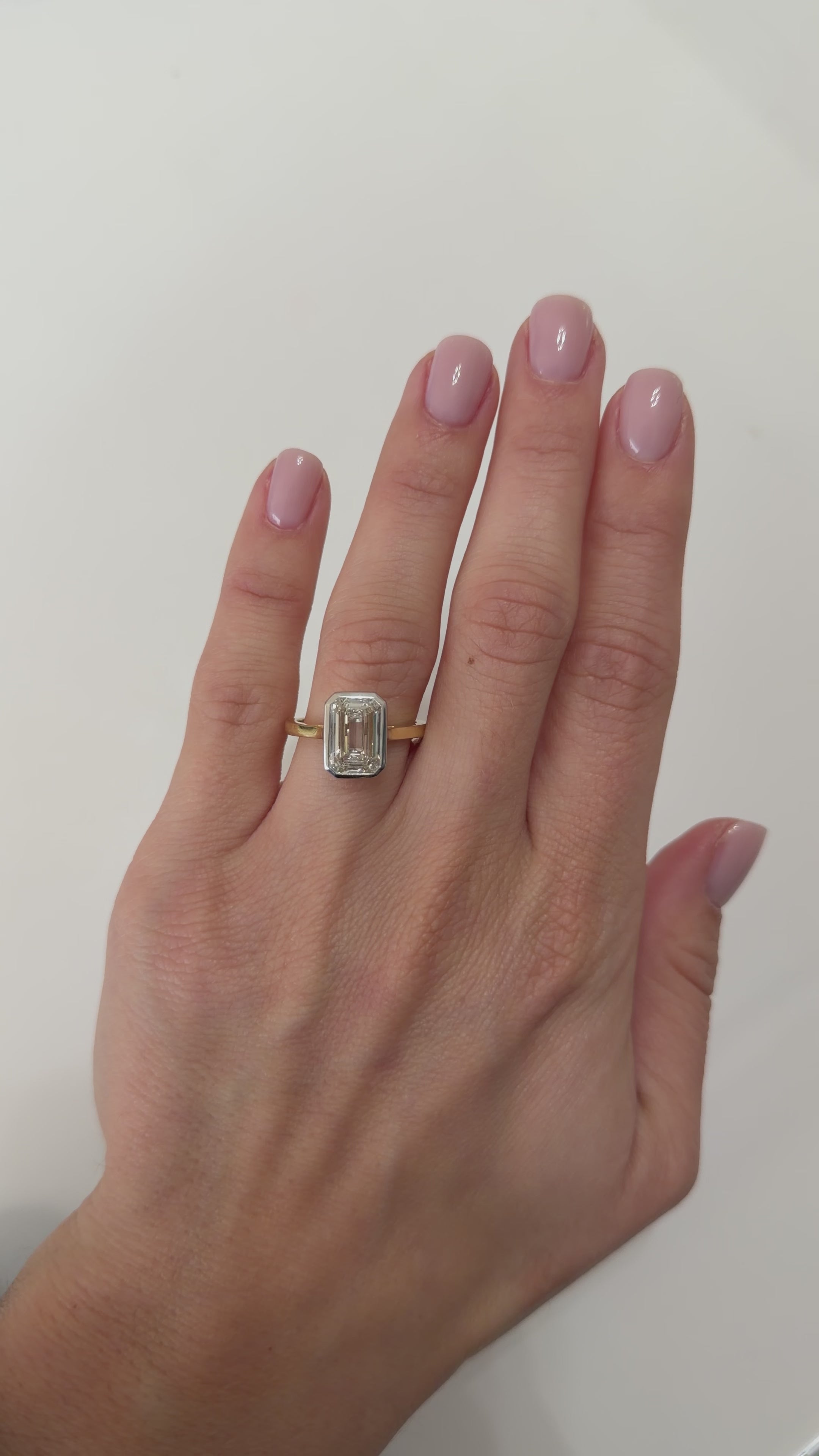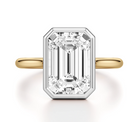 This 4.09ct emerald-cut lab-grown diamond is framed by a sleek white gold bezel with a yellow gold cathedral shank — a striking blend of modern design and timeless contrast.