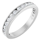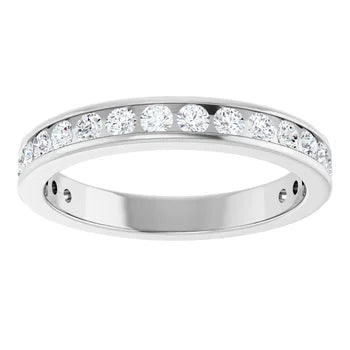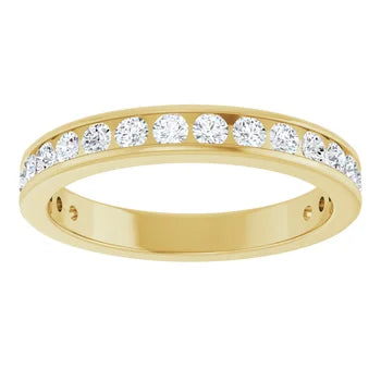 Our Channel-Set Diamond Wedding Band is the perfect blend of old-school elegance and modern revival. What was once a quiet staple in fine jewelry has reemerged as one of today’s most sought-after styles—loved for its clean lines, durability, and effortless sophistication. Single row of diamonds securely nestled within a sleek channel of precious metal.